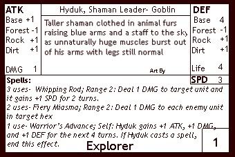 1x Hyduk, Shaman Leader- Whipping Rod can take out weakened enemy units or spur a last minute flag capture. Fiery Miasma is a great 1 hex spell that only affects enemies.