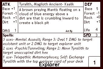1x Tyralith, Magiloth Ancient- Tyralith is simply the best explorer to retrieve the artifact late in the game. Too early in the game for that? That's easy, just morph him into one of your other two explorers and save him for later.